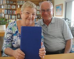 Dr. Rosalind and her diplomat husband Meir Romen holding two of Rabbi Abrahams celebrated works – :Living Waters’ and ‘Pathways in Judaism’.