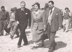 “The Founder of Israeli Bowls” Max Spitz (left) is seen here walking with Golda Meir (centre) in Ashkelon in the 1950s . It is uncertain whether Max was suggesting where to build a bowls club!