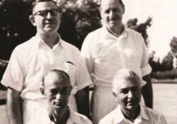 The Four Musketeers. Participating in the 4th Maccabiah in 1953 are “the pioneers of Israel Lawn Bowls” – former South Africans (top (l-r) Percy Manham and seated (l-r) Jack Raphael and Max Spitz and Englishman Wellesley Aron (top right).
