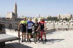 Sites from the Saddle. Promoting the upcoming Giro d’Italia starting in Jerusalem is former Giro winners Alberto Contador and Ivan Basso, the Mayor of Jerusalem, Nir Barkat, and entrepreneur and fervent cyclist, Sylvan Adams with David’s Tower (left) and the King David Hotel (right) in the background.