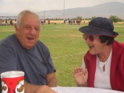 Arnie Freedman (left) after a hearty Israeli breakfast enjoys watching rugby at Kibbutz Yisreel.