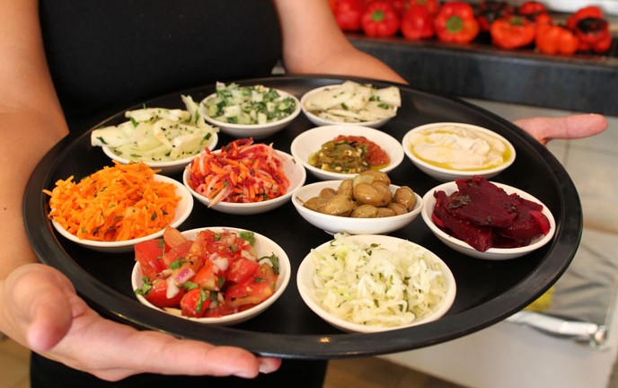 Any seasoned traveler to Israel is familiar with the major difference between an Israeli breakfast and those elsewhere in the world – “No meat.” In accordance with the Jewish laws of Kashrut (keeping kosher), meat and dairy ingredients are never served together in a meal. The Israeli breakfast is thus a dairy meal, and a variety of cheeses are offered. Fish is considered pareve and so is permitted, and herring is frequently served. Other smoked or pickled fish dishes are also common, including tuna and salmon. Egg dishes are almost universal, which may be pre-cooked or cooked to order. The Middle Eastern egg dish shakshouka, a spicy North African concoction of eggs poached in a tomato-pepper-onion sauce is a common choice. However, Jewish food writer and historian Gil Marks told ISRAEL21c that this iconic dish “is actually a latecomer to the already laden Israeli breakfast table.” The classic must-haves, he says, “are scrambled or hardboiled eggs, a variety of chopped vegetable salads, porridge, cheeses, fresh breads, plain and flavored yogurts, fruit and granola, washed down with fresh juice and/or coffee or tea.” Other Middle Eastern dishes may include Israeli salad, hummus, tehina, baba ghanoush and the strained yogurt called labaneh. Fresh vegetables such as tomatoes, cucumbers, green peppers, radishes, onions and shredded carrots are common, as are a variety of olives, both black and green. Enjoying an Israeli breakfast is one of the pleasures of a visit to Israel. Apart from the hotels, restaurants and small cafés will all offer one version or another of this famous breakfast. Some places serve it throughout the day, so you can even have one for lunch or even diner. Like Israeli salad, this breakfast is not locally called an “Israeli breakfast”. In restaurants and cafés it’s sometimes named after the establishment, or it is just called “breakfast”. If you see a breakfast on the menu offering eggs, coffee/tea, salad, cheeses and juice – rest assured, it’s an Israeli breakfast!