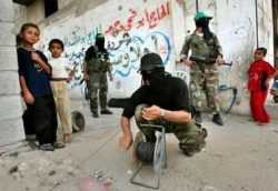Hamas Education. Masked Hamas terrorists in Gaza launching rockets against Israel watched by young children.