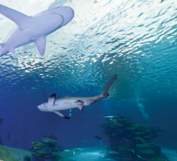 Facing the large windows are rows of seats in an amphitheater that allow visitors to sit and stare in fascination as tiger sharks, hammerheads, sand sharks swim around the coral. Joining them are walruses, sea bats, stingrays and thousands of fish that coexist in perfect harmony.