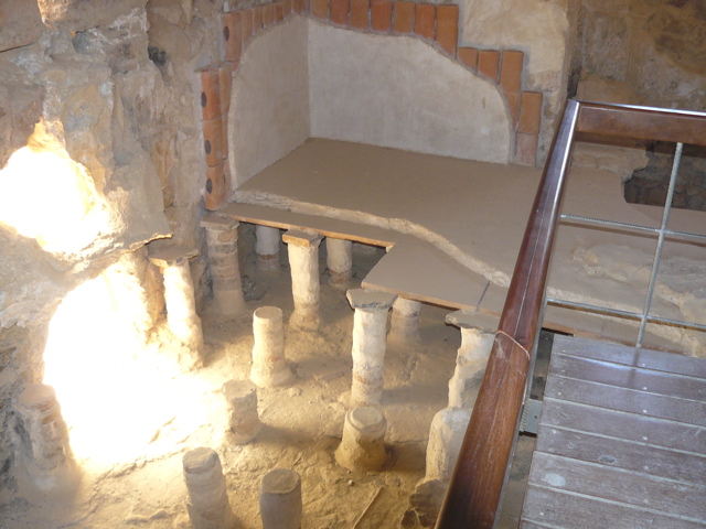 So now, we will go down to the Bathhouse. Of all the leisure activities, bathing was surely the most important for the greatest number of Romans, since it was part of the daily regimen for men of all classes. We think of bathing as a very private activity conducted in the home, but bathing in Rome was a communal activity, conducted for the most part in public facilities that in some ways resembled modern spas or health clubs, although they were far less expensive. Bathing had a fairly regular ritual, and bathhouses were built to accommodate this. Upon entering the baths, individuals went first to the Dressing room (Apodyterium). Although the evidence is not clear about exactly what Romans wore when bathing, it seems probable that they did not exercise in the nude, as Greek males did. The large central courtyard was the exercise ground (Palaestra). After changing clothes and oiling their bodies, male bathers typically began their regimen with exercise, ranging from mild weight-lifting, wrestling, various types of ball playing, running, and swimming. After exercise, bathers would have the dirt and oil scraped from their bodies with a curved metal implement called a strigil. Then the bathing began; accompanied by a slave carrying their towels, oil flasks and strigils, bathers would progress at a leisurely pace through rooms of various temperature. They might start in the warm room (tepidarium), which had heated walls and floors but sometimes had no pool, and then proceed to the hot bath (caldarium), which was closest to the furnace. Roman engineers devised an ingenious system of heating the baths—the hypocaust. The floor was raised off the ground by pillars and spaces were left inside the walls so that hot air from the furnace could circulate through these open areas. After this, the bather might spend some time in the tepidarium again before finishing in the cold room (frigidarium) with a refreshing dip in the cold pool. Other rooms provided moist steam, dry heat like a sauna, and massage with perfumed oils. All in all, it was a perfect way to end the work day and socialize, or do a little business before going home to the wife and family. The Bathhouse on Masada is one of the best preserved in Israel. We can still see some of the original tile flooring and frescoes on the walls. The caldarium is one of the most impressive sites on Masada. It is a definite “must see.”