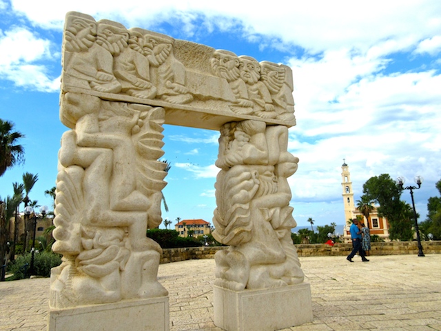 Most of the buildings we see today were built during the Turkish Ottoman Empire. They are made from sandstone, called Kurkar. This sandstone is so strong that these 400 year old buildings should still be standing for hundreds of years to come. On our way into town, though, I want to stop at a beautiful overlook of Jaffa and Tel Aviv. In the courtyard stands a sculpture called the Gate of Faith, by Daniel Kafri in 1977. It symbolizes the move of our ancestors to the Promised Land. It has the appearance of an ancient city gate, with pillars on each side and a mantel over the top. One pillar represents Abraham and the sacrifice of Isaac and the other of Jacob’s ladder dream. The top beam depicts the conquest of Canaan by Joshua and shows the priests carrying the Ark of the Covenant over the Jordan River and into the Promised Land.