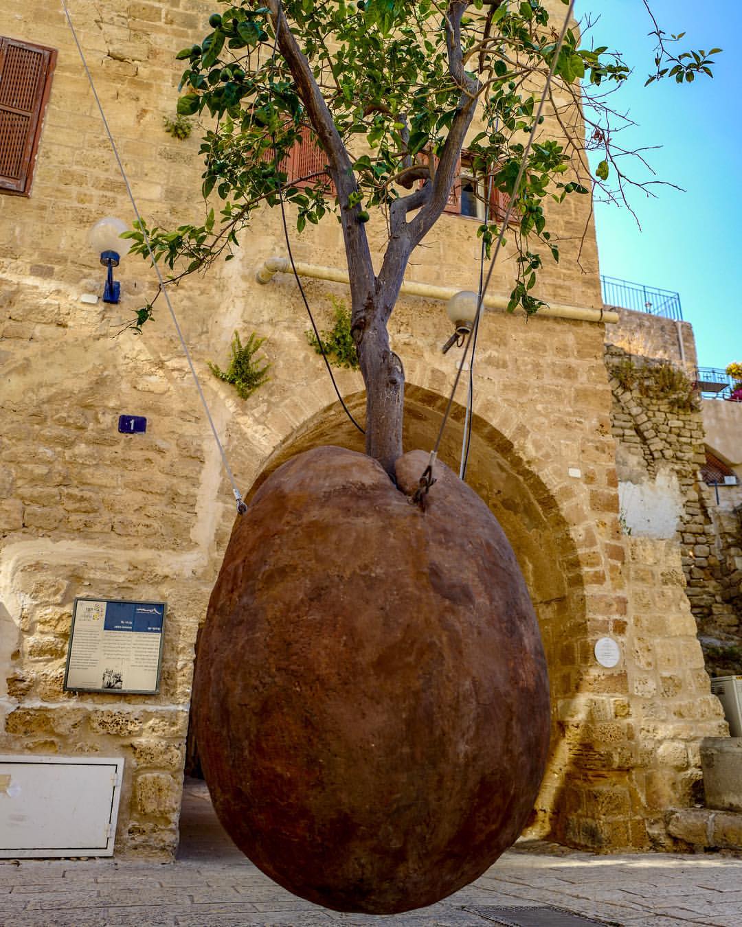 Let’s take a stroll through the cobblestone streets of Old City Jaffa. A suspended Orange Tree sculpture hangs in a small alleyway, as a reminder of the Jewish plight. Jaffa oranges were the primary citrus export out of this seaport for the better part of the 19th and 20th centuries. So it was very befitting that the artist, Ran Morin, used what the city was best known for as the focal object of his work. He planted a living orange tree inside of a large sculpted orange and hung it in suspension by two chains. Morin said, “My growing sculptures show a ‘rooted-uprooted’ state while going on living, much as we do, growing into an unclear future.” This is such a life lesson; to keep living and keep growing even in the face of adversity or uncertainty. This is something to strive for, for sure.