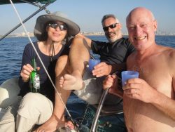 L’Chaim (“Cheers:). Katharina Haendler from Kibbutz Nir Eliyahu, Martin Wolff from Ra’anana (ex-Cape Town) and visitor from Australia, Alan Abrahams (ex-Johannesburg) off the coast of Netanya.
