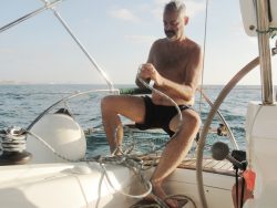 Soon we were having lessons how to increase our speed one nautical knot at a time. A release here and a quick tightening there did the trick and was rewarded “as is the custom” by a celebratory schnapps. It also cleared up the question as to the connection between measuring speeds at sea and knots. Taking us back to the pirate days of Blackbeard and Captain Kidd, Jonny explained how “these sailors would tie knots along a long line of rope at regular intervals, and then cast one end (weighted down by a floating piece of wood) out behind their vessel. The number of knots let out in a given period of time – measured, usually, by a small hourglass – would allow them to calculate the distance and consequently the speed at which the boat was moving.”