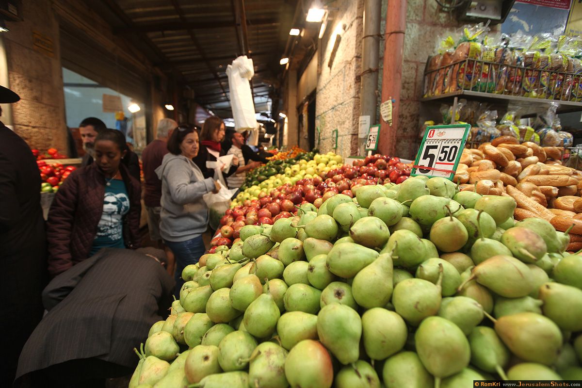 Fluid Hebrew with perfect grammar is intertwined with scatterings of English and Americanised pronunciations as people of every race, religion, country, and age experience the melting pot where Israelis buy the ingredients for their own melting pots. Pushing is not considered impolite in Israel as much as it is a form of self-defence required by every person who wishes to be served.