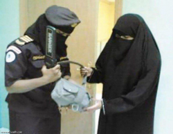 A special Saudi Women security force in Saudi Arabia to examine women in every public place (holding a Metal Detector)