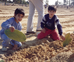Sabras planting Sabras. Planting cacti on TuBishvat on Revivim some years back, are the children of former South African Wendy Cohen- Solal (Nee Israel from Parow)