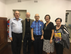 The writer meeting with members of the small Jewish community at the Rodis Hall, Sephardic Synagogue, Harare. (l-r) Arnold Joffe, Dave Bloom, Benny and Rose Leon, Sonia Levy