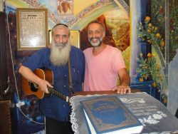 In the heart of the Ben Shemen forest, is located the picturesque moshav (unique farming village) of Mevo Modi’in, the home of the late Rabbi Shlomo Carlebach. Considered by many to be the foremost Jewish religious songwriter of the 20th century, “Reb Shlomo” was a religious teacher, composer, and singer who was known as “The Singing Rabbi”. He created his own style combining Hasidic Judaism, warmth and personal interaction, public concerts, and song-filled synagogue services. His influence continues to this day in “Carlebach Minyanim” and Jewish religious gatherings in many cities and remote pristine areas around the globe. One such place is the unique synagogue – now a famous tourist attraction – at Mevo Modi’in, where we met two of Carlebach’s followers, one of whom is a renowned artist, who painted the synagogue’s interior walls. A colorful depiction of nature and animal life, Yitzchak Ben Yehudah’s unique brushwork draws the eye and touches the heart. Little wonder visitors flock here. “I arrived here with my young wife and child twenty years ago on a visit,” says Yitzchak. “We arrived during the festival of Passover – all the more special as my family had fled as refugees from Egypt in 1956 following the Suez War. Carlebach was ‘in full swing’ with over 150 people in this synagogue jumping up and down to the music. It was a visit I thought would be twenty minutes and here I am twenty years later.” Hardly a tree in sight when he arrived “I have since planted over 4,000 trees,” contributing to the rich forestation of the area. No less impressive, “We have 25 grandchildren.” Matching the vibrant color of the synagogue’s décor, are its no less colorful congregants. Originally from Brooklyn, New York, Ben Zion Solomon dropped out studying for his Masters in musicology at Berkley and joined with his wife a commune in the woods of California. “It was the hippy age and we were like so many others trying to find ourselves. We were both very spiritual people but just not connected to our Jewish roots.” While in the forests, “I jumped in my truck and drove to Carlebach’s House of Love and Prayer in San Francisco. Before even speaking to him, I listened to him teaching a group and realized he had answered all my questions. I had found my rabbi!” The Solomon family immigrated to Jerusalem and shortly thereafter, joined an American group of immigrants headed by Rabbi Carlebach that were offered a baron piece of uninhabited land that is now the rich fertile moshav of Mevo Modi’in. “Because our marriage was not halachically (officially) recognized in Israel, Shlomo married us again. He composed a beautiful piece of music for our wedding ceremony that is to this day, sung every Shabbat (Sabbath) in our synagogue.” “Can we hear it?” I asked. Out came the guitar and for the next five minutes, Ben Zion played and sang the melodious composition that so captured the love of two people and the eternal love between Jews and their God. It was little wonder to hear that this synagogue “is packed every Shabbat.”